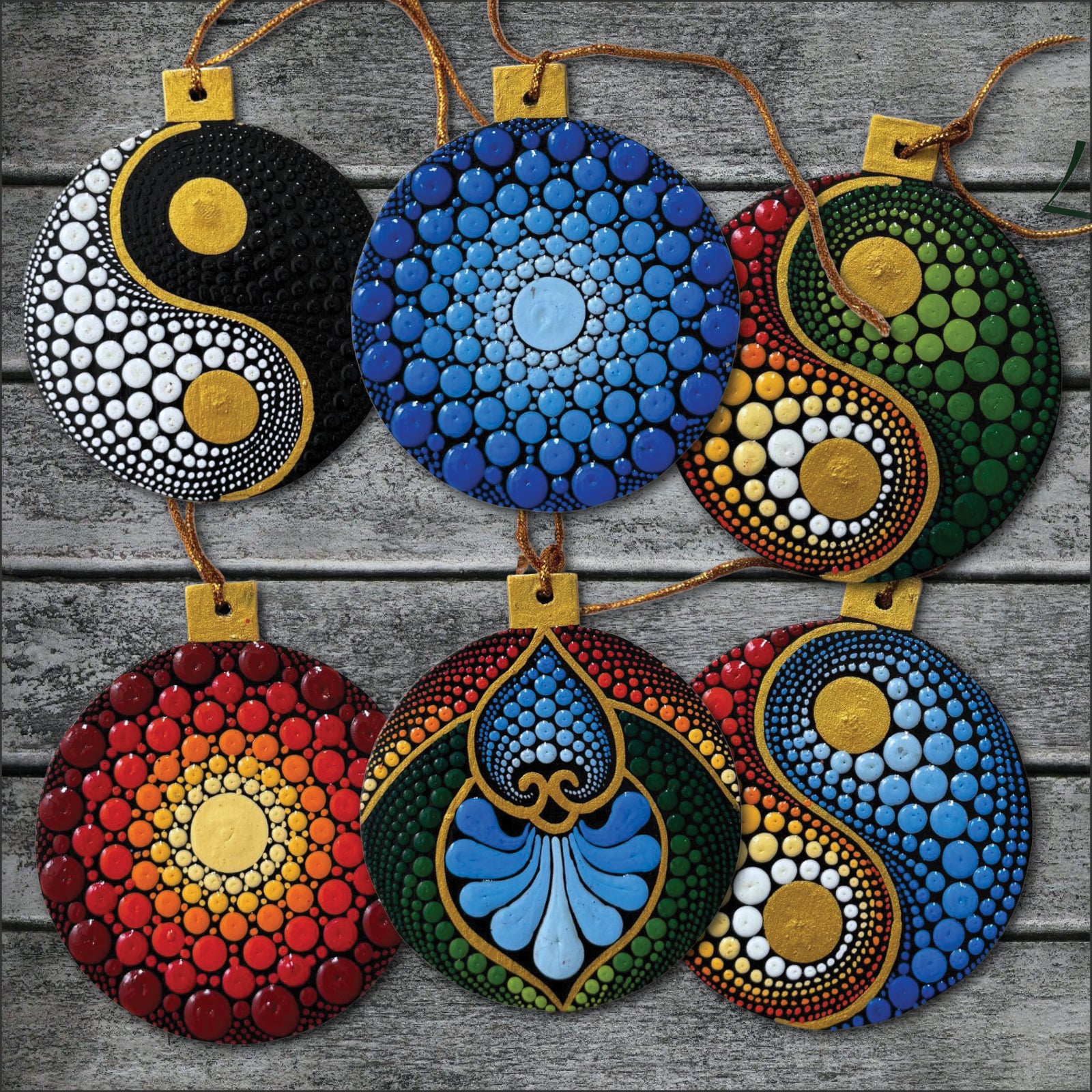 Each star has different color themes, some dark and some brighter. What they all have in common is the intricacy of design and attention to detail. A tiny hole is drilled in the top of each, and a gold cord is attached.